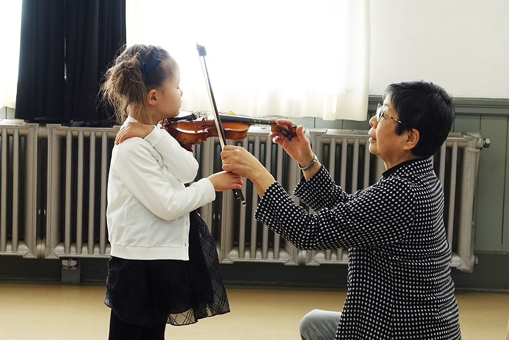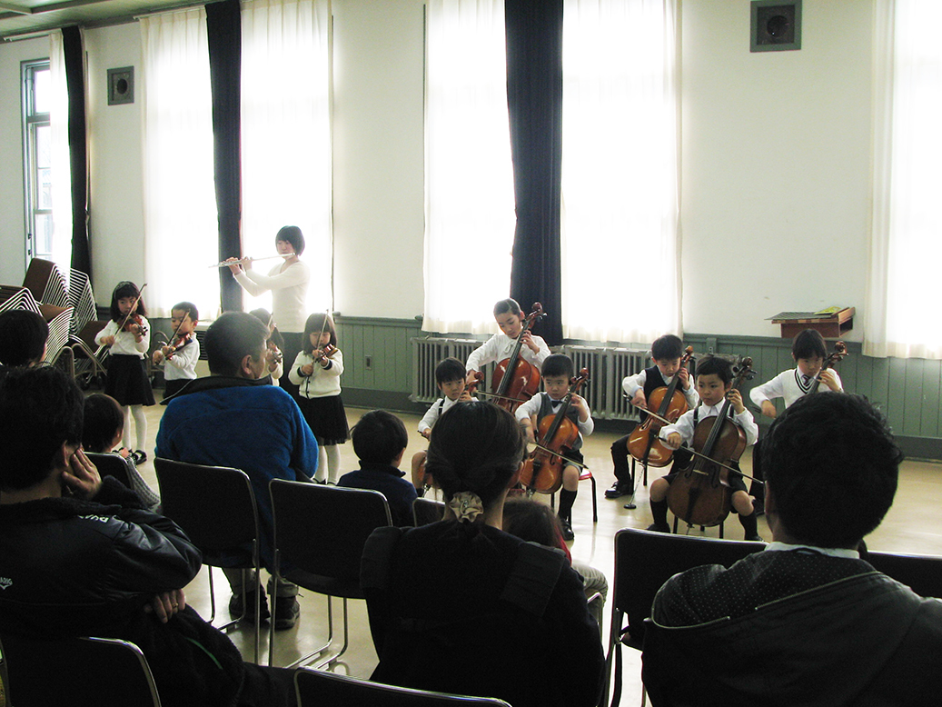 初歩の生徒はごあいさつ、弓ふり、キラキラ星のタカタカタッタのリズムを披露しました。まだ曲は弾けないけれど、一生懸命な姿に参加者から大きな拍手をもらいました。
