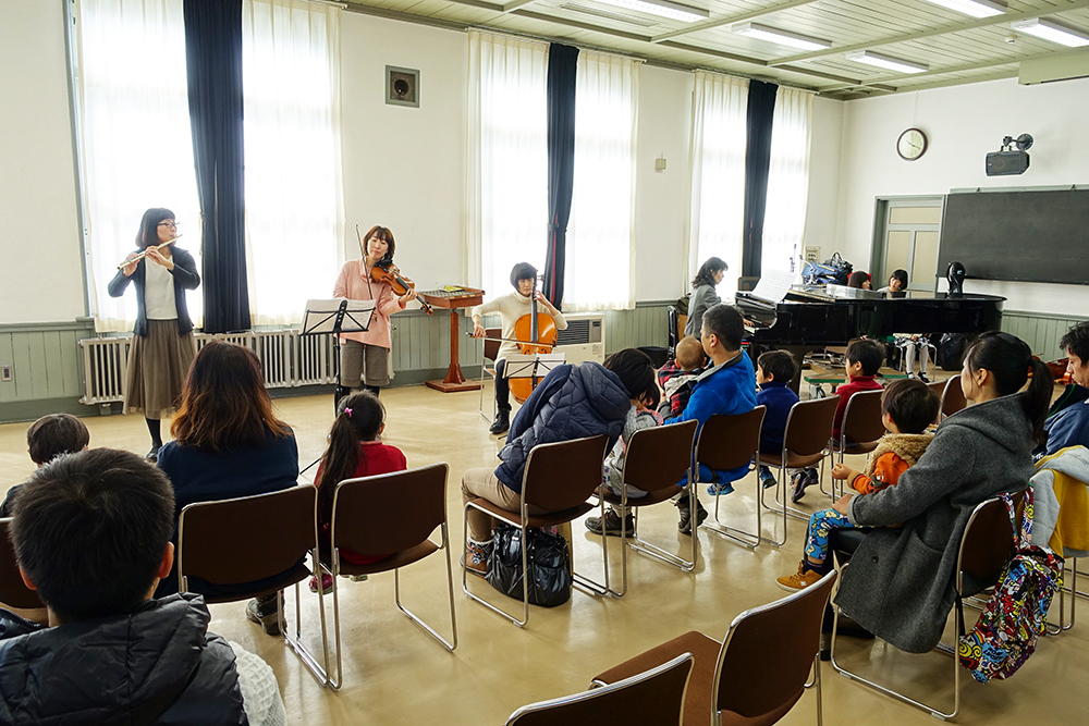 春の楽器体験会を行ないました。参加の子どもたちは、間近で演奏される楽器の音を楽しそうに身体をゆらして、「キラキラ星変奏曲」などを聴いていました。生徒たちの演奏に加えて、先生たちの演奏も披露しました。♪ 「グリーンスリーブス」と「妖精の踊り」を演奏しました。