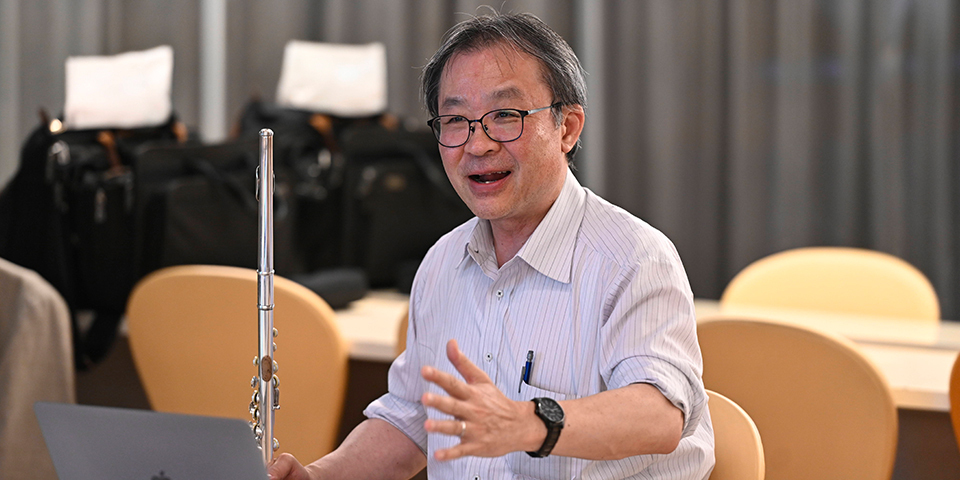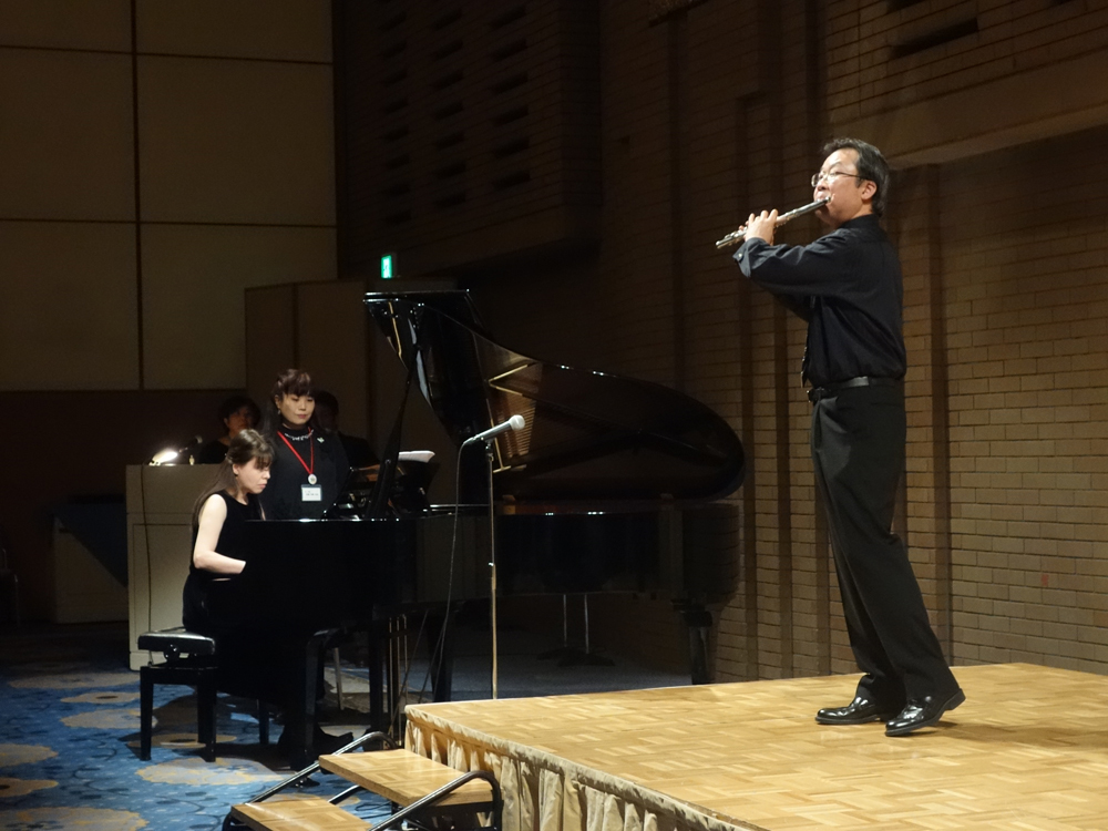 もう一つは、音楽家としての側面です。この日は、全科の指導者が一堂に会した懇親会の席で、超絶技巧曲で知られる「カルメン・ファンタジー」(ビゼー作曲、ボルヌ編曲)の素晴らしいフルート演奏を披露(ピアノ:ピカリ直美先生)。先生方を魅了しました。