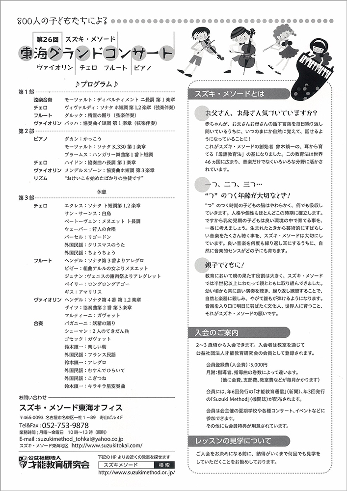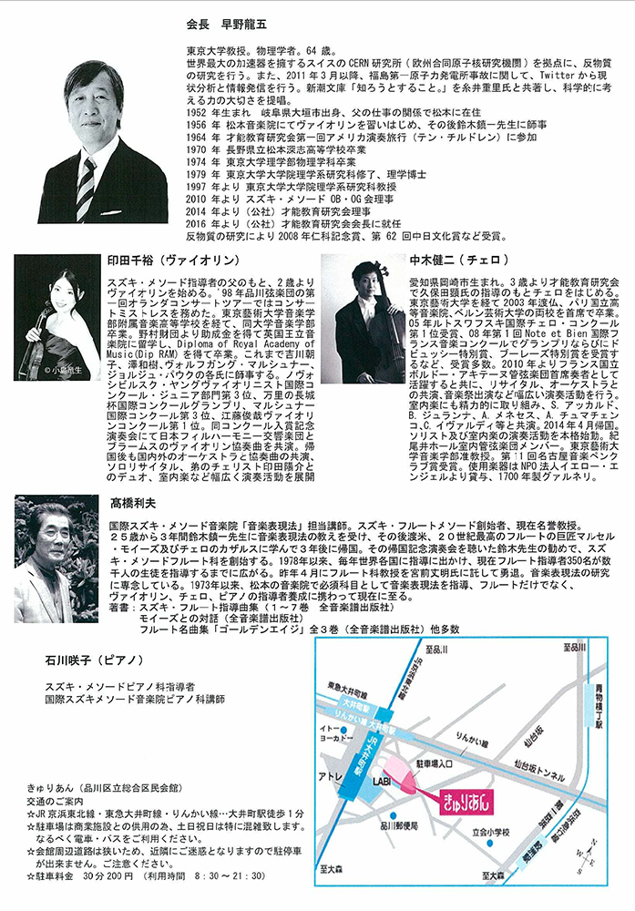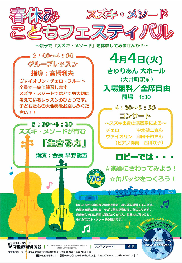 そしてスズキ出身の二人の演奏家、チェロの中木健二さん、ヴァイオリンの印田千裕さんによるコンサート、早野会長の講演「スズキ・メソードが育む<生きる力>」がありました。楽器体験コーナーもありました。盛りだくさんなプログラムで充実した一日となった様子が、スズキ・メソードのWebマガジン「マンスリースズキ4月号」で詳しく紹介されています。