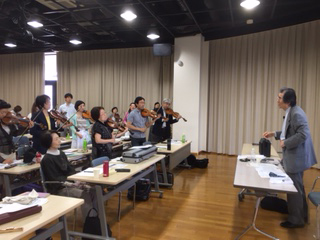 また、私ども指導者は松本の音楽院(指導者になるための学校)で髙橋先生に「音楽表現法」や「弦楽合奏」を指導していただきました。今日は指導者も生徒さんたちと一緒にヴァイオリンやチェロ、フルートを演奏しました。生き生きと弾いている姿が印象的でした。