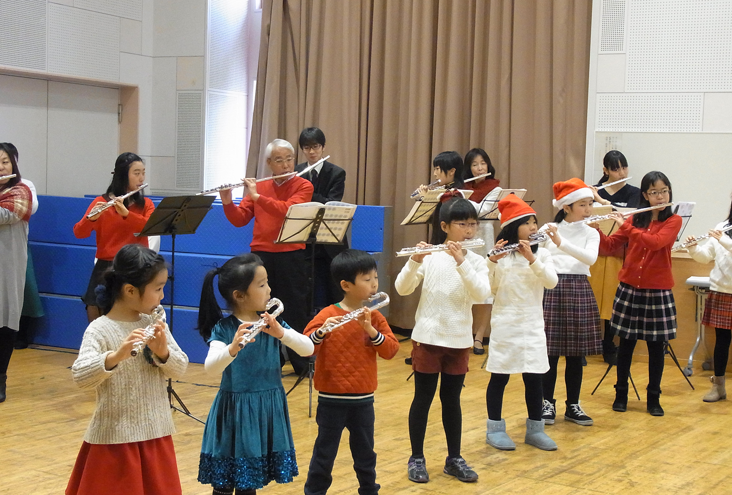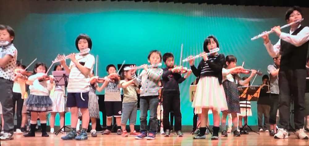 この日の最後には、前半のプログラムである第22回アンサンブル・フェスティバルに参加していたヴァイオリンとチェロの子どもたちも多数参加して、「キラキラ星変奏曲」を演奏。ここでもフルートのオブリガートとの合奏になりました。