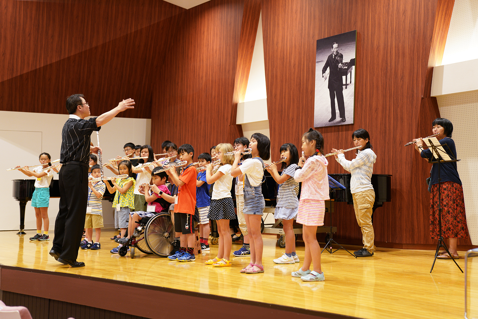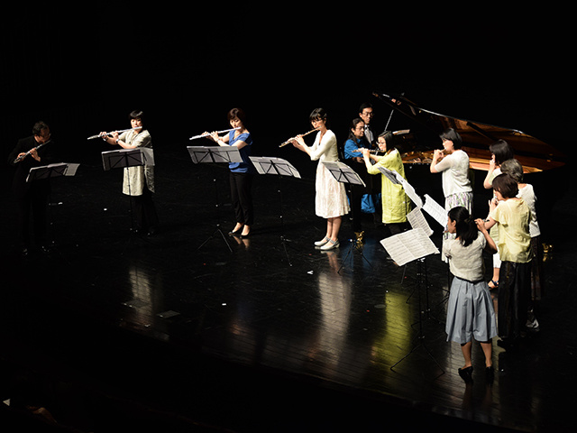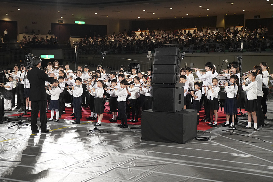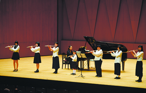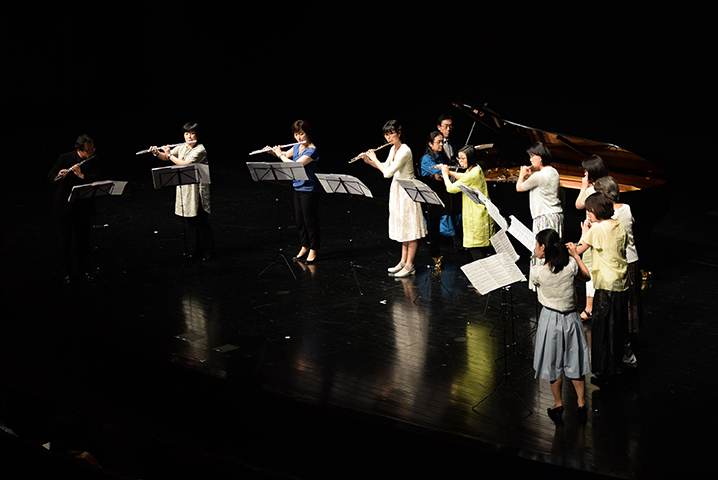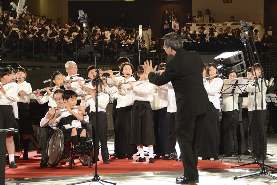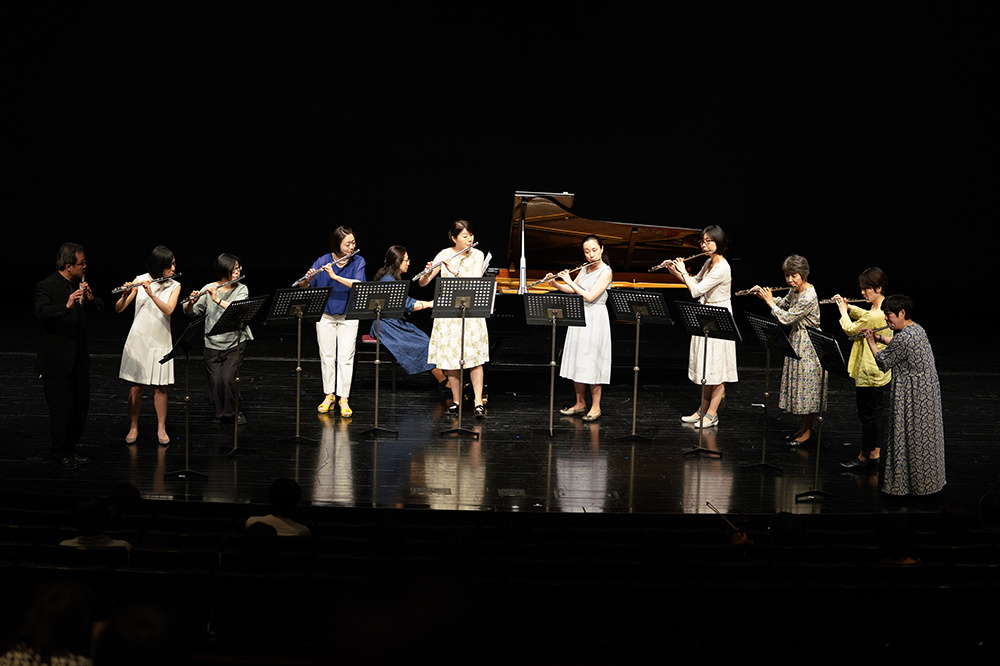 9年ぶりに開催となった今回は、鈴木鎮一生誕120周年記念でもあり、天皇皇后両陛下、高円宮妃久子殿下のご臨席の元、フルート、ヴァイオリン、チェロ、ピアノの生徒たちが全国から集まり、海外からの参加も含めて約2000名が演奏するコンサートになりました。フルート科では台湾とオーストラリアからの参加がありました。