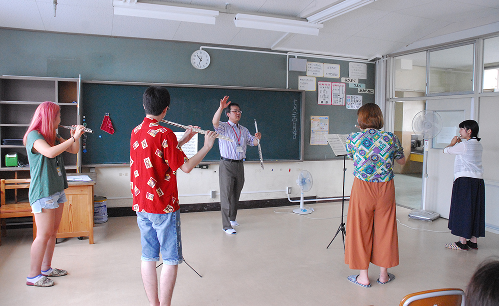フルート科は今年も参加したオーストラリアや台湾からのお友だちと一緒に、午前中は市立本郷小学校をお借りしての、クラスレッスンでした。