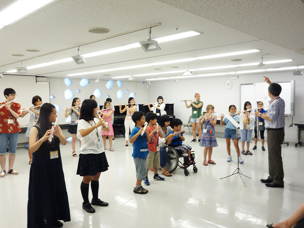 酷暑の中、7月31日より4日間の日程で夏期学校が行なわれました。今年は会場の関係で、開会式が行なわれず、午後のグループレッスンからのスタートとなりました。早野龍五会長、中島顕実行委員長が各会場をまわり、開会の挨拶をしてくださいました。フルート科では、台湾、オーストラリアからの生徒さんも参加し、英語や中国語が飛び交い、音楽を通した国際交流もできました。1日目の夜には早速マスタークラスがあり、上級生はクヴァンツの協奏曲を宮前丈明先生からレッスンしていただきました。