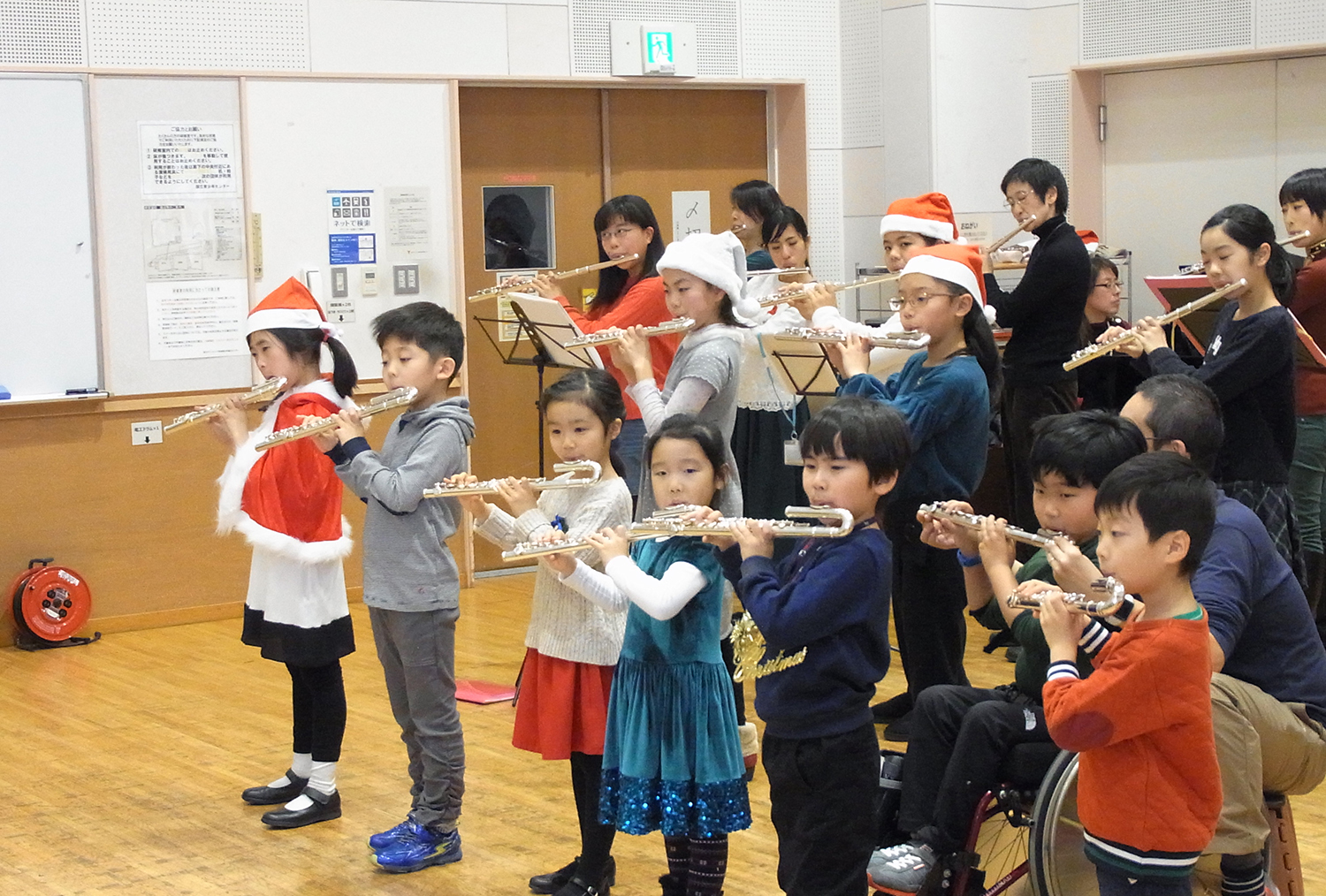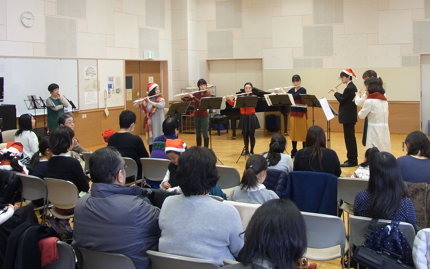 初歩の生徒さんからマスタークラスの生徒さんまで4教室に分かれてのレッスン。普段のレッスンとは違う先生、違うお友だちとのレッスンは、とても新鮮なことで、最初は緊張気味でしたが、自己紹介をすませてフルートを吹き始めると、皆いきいきと吹いていました。
