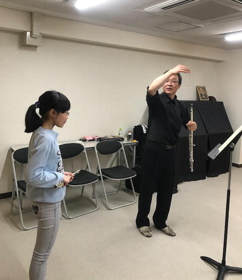 初歩の曲では、「メリーさんの羊」を音楽的に演奏すること。「きらきら星変奏曲」では、響きを客席に届くよう、音の形を聴きながら吹くこと。グルックの「メヌエット」では、柔軟にピアニッシモを出すこと。「かっこう」ではフレーズを大きく取ることなど、一つの曲ごとに音楽性を豊かにする大切なワンポイントが伝授されました。