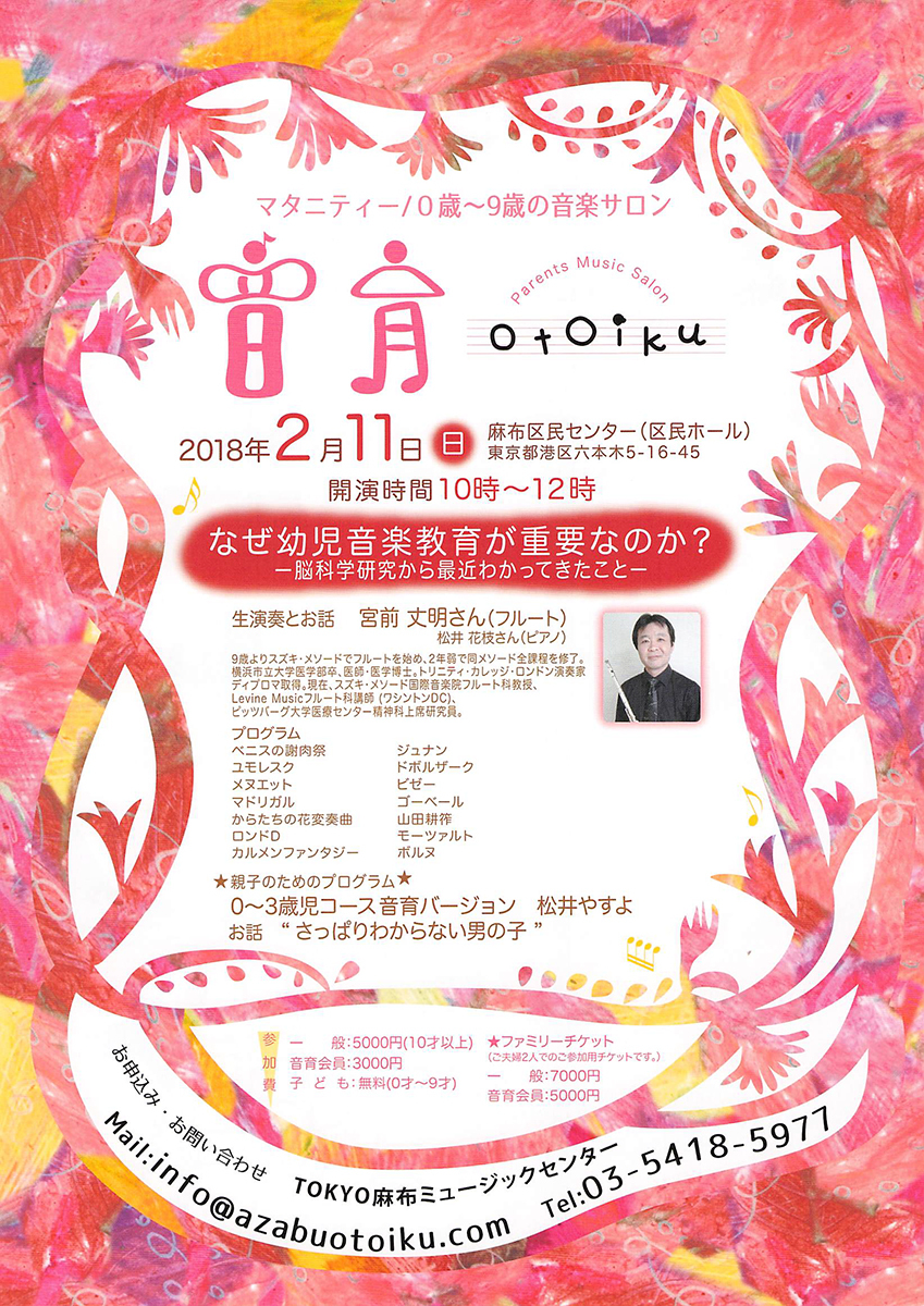スズキ・メソード国際音楽院フルート科教授であり、ピッツバーグ大学医療センター精神科上級研究員でもある宮前丈明先生は、「なぜ幼児音楽教育が重要なのか? 脳科学研究から最近わかってきたこと」というテーマで、子育て中のお母さんやお父さんを対象に、今だからこそ重要なことをお話しされました。ご自身はスズキ・メソードで9歳からフルートを始め、11歳でスズキの教育課程をすべて終了。当時来日したフルートの巨匠マルセル・モイーズを驚嘆させたというエピソードをお持ちです。